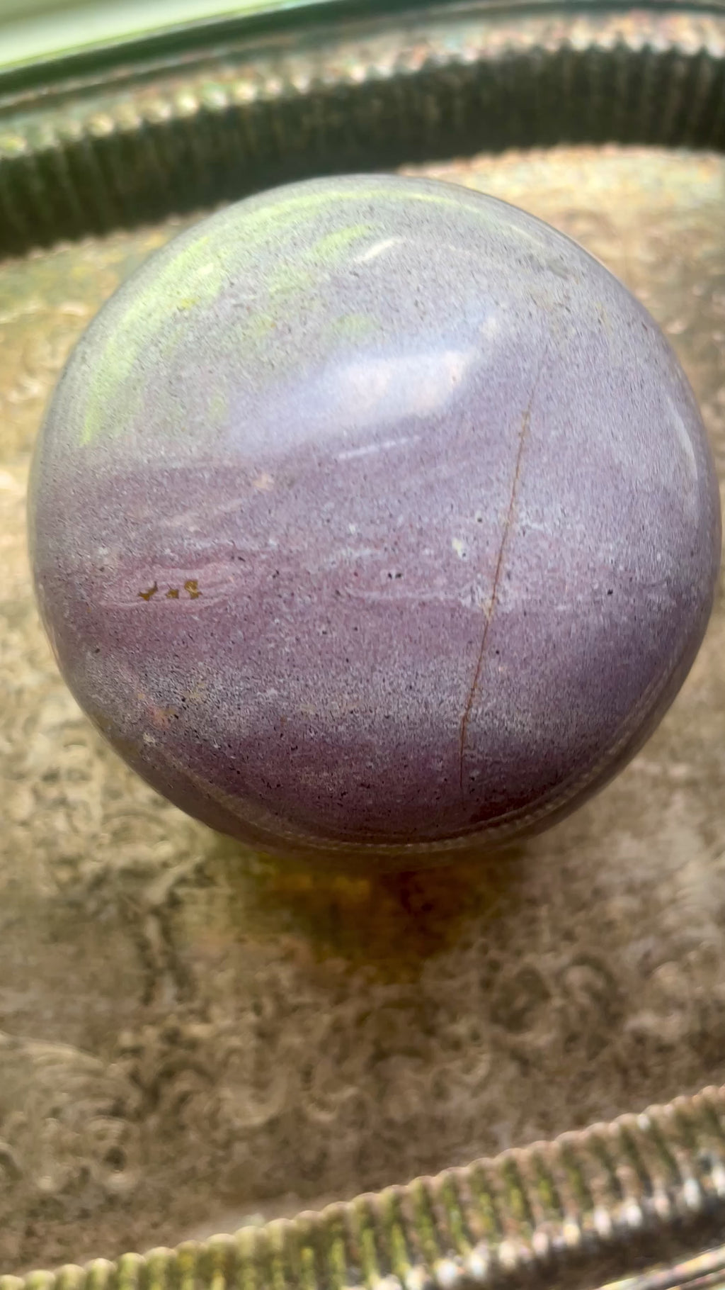 This heavy and frosted purple crystal sphere is colored in the likeness of mulberry jam! Reminiscent of something a sugar plum fairy would have on her bookshelf, this Ocean Jasper sphere is a statement piece and would look great on an altar or specimen case.