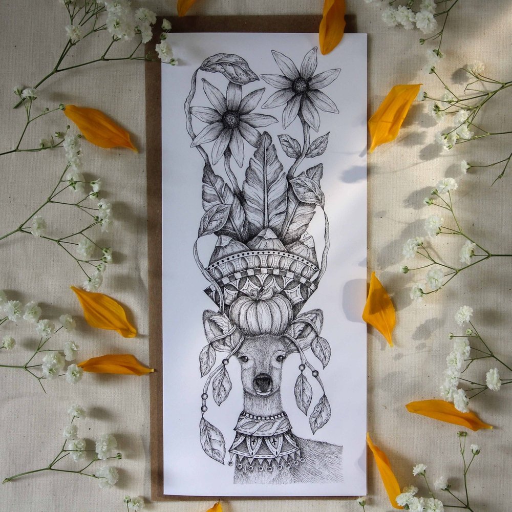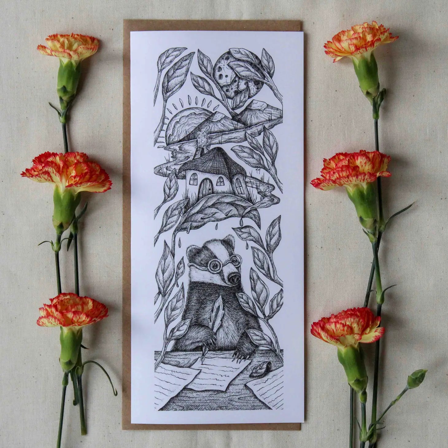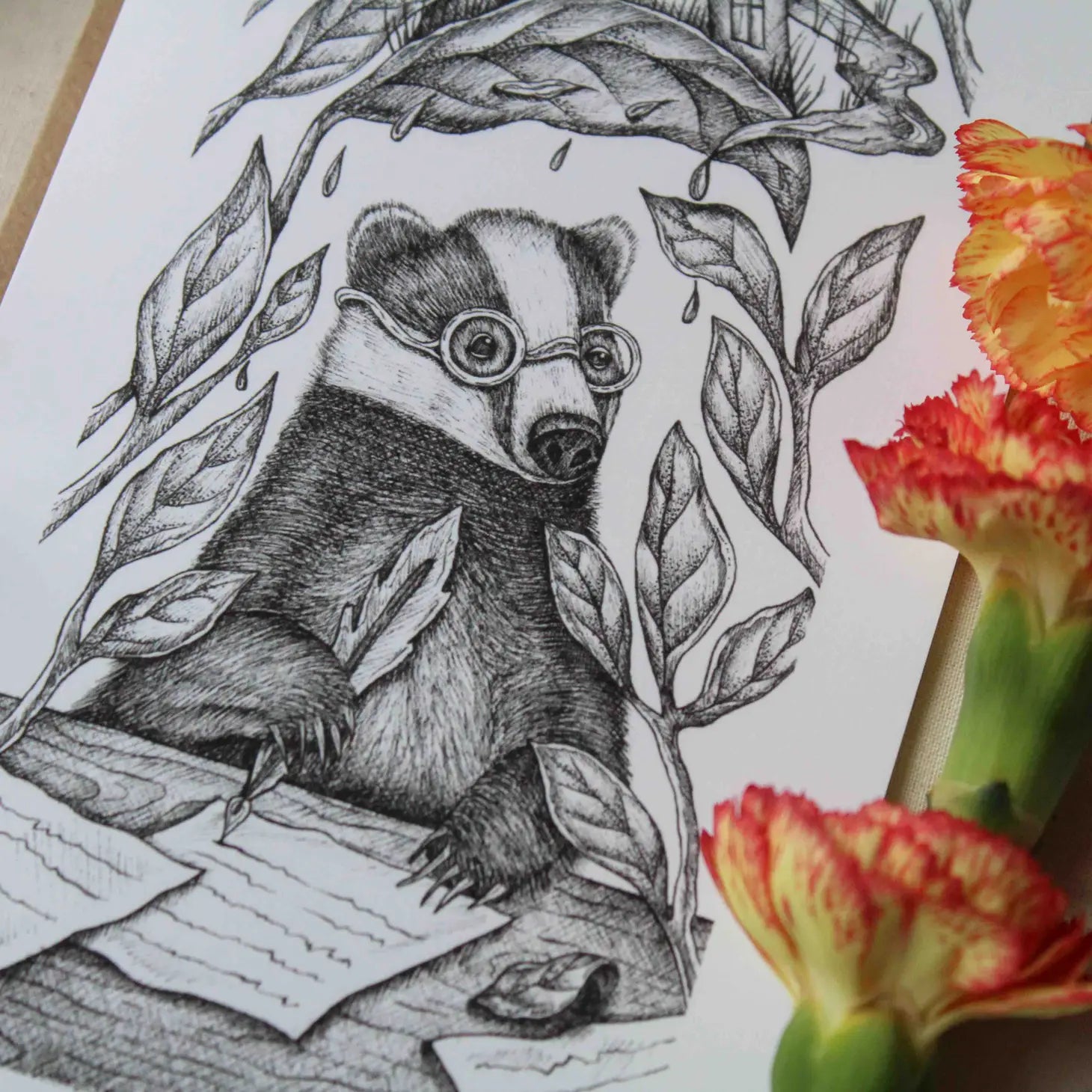 "I create whimsical pen and ink drawings rooted in nature and storytelling. My artwork and stories are grounded in reality, but they also live in a fantastical world where raccoons bring ice cream sundaes to parties and rabbits craft the most excellent olive oil throughout Europe."
