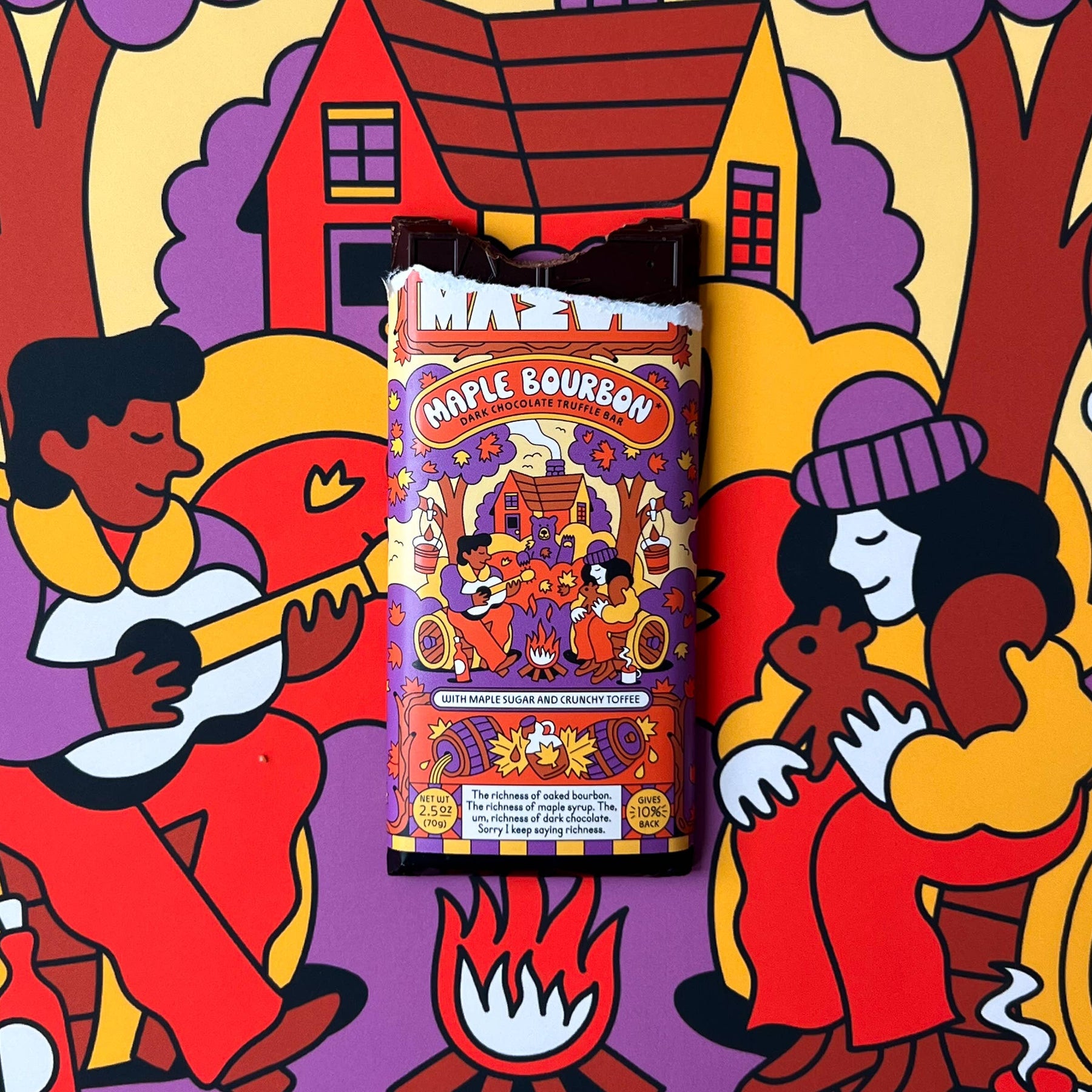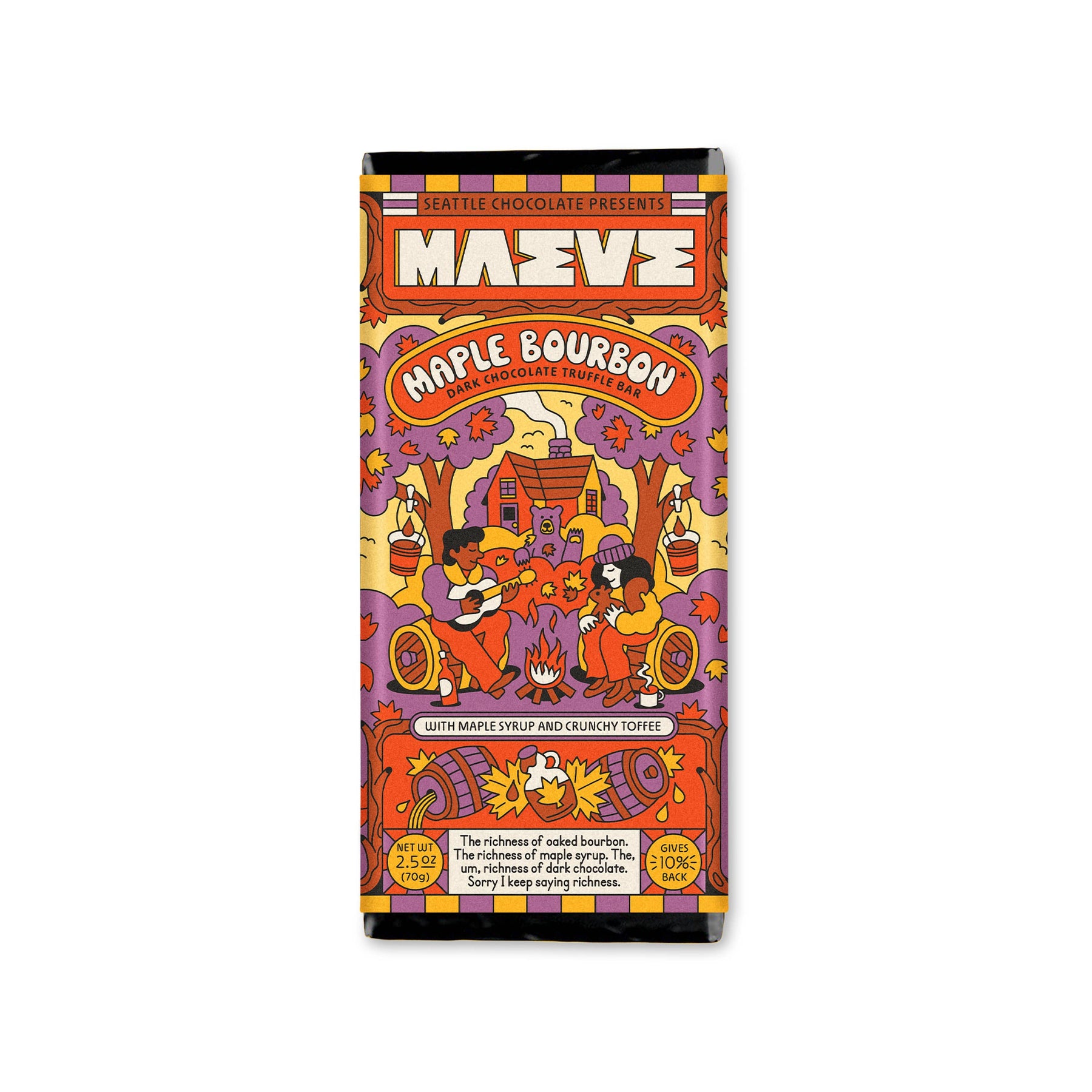 Maple Bourbon - The richness of oaked bourbon, maple syrup and crunchy toffee in dark chocolate!